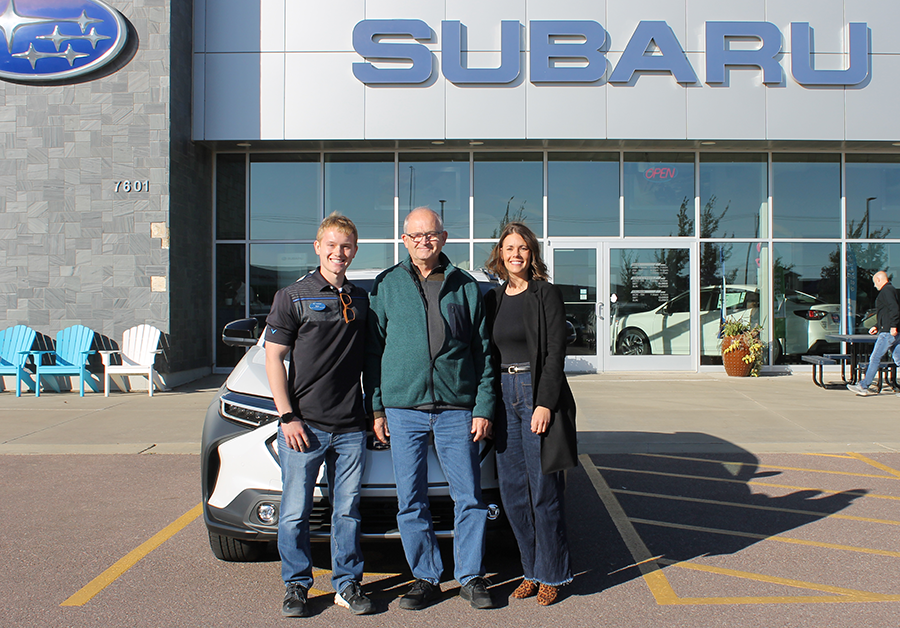Above: Schulte Subaru Sales Associate Ethan Sachen, raffle winner Dan Hodny and CHS Director of Events and Volunteer Management Erica Krohn stand in front of Dan’s new car.
